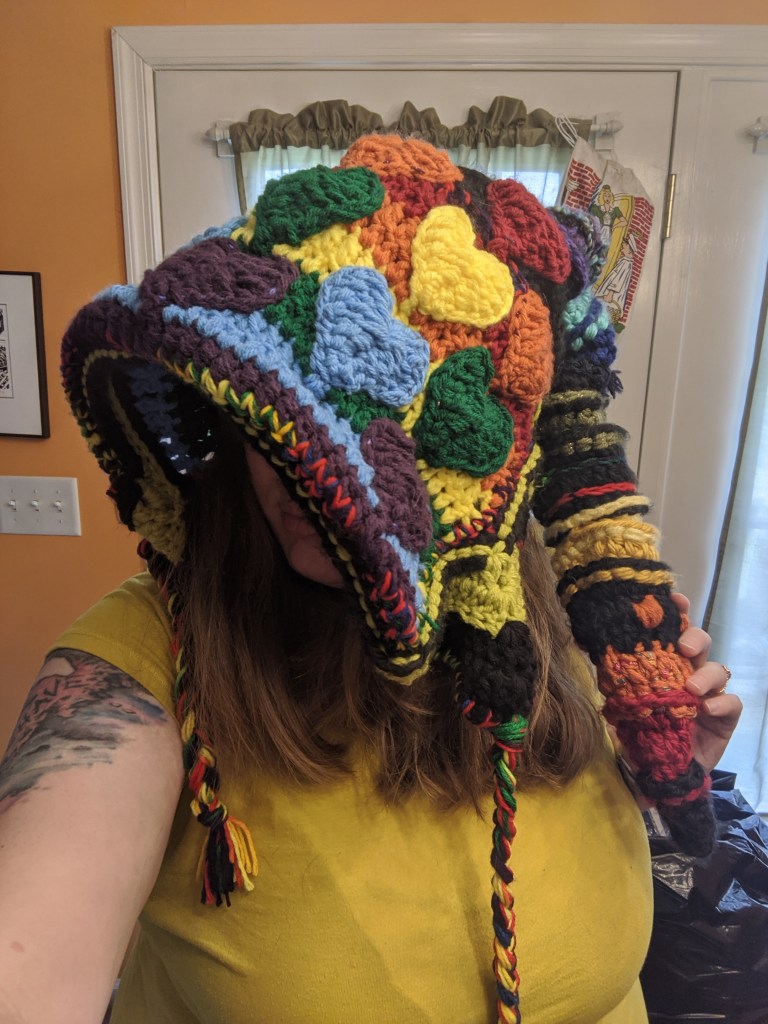 The last days before lockdown and the early days of quarantine, I’ll admit, get a little more…. let’s go with “outside the box” in terms of design. Here, I’m starting to experiment with design and write some stuff down that is either available for purchase as a pattern or will be soon. Look for a Birthday Cake Hat pattern coming soon to a pattern purchasing platform near you! This Flatwoods Monster hat you see being modeled ever so handsomely by Mr. Wolf Bite has gone back to the drawing board and will hopefully be available in a more fleshed out version early in 2021.