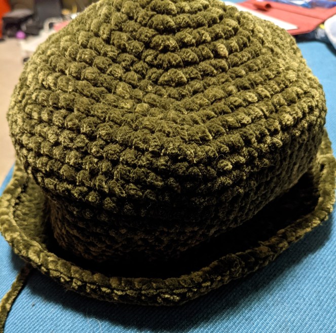 -Note: Brim should be curling by now. That’s good. See above. Back to the original st pattern for the rest of the hat.