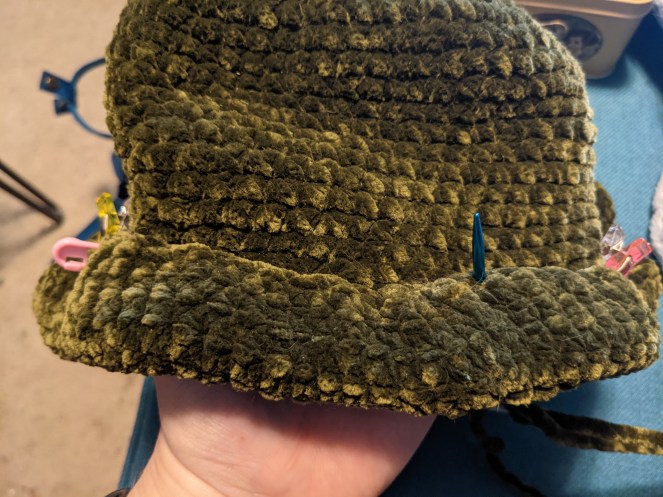 Sl st in nxt 2 sts, FO leaving a super long tail. We’ll be using that tail to fold the brim back and stitch it to itself.
