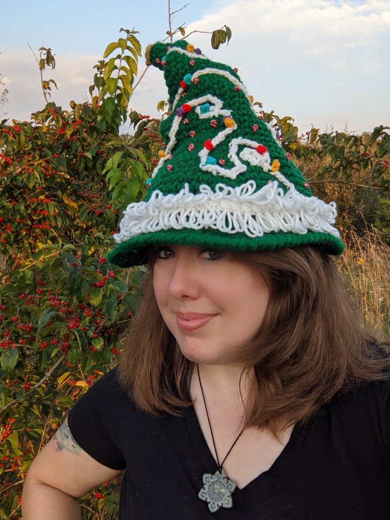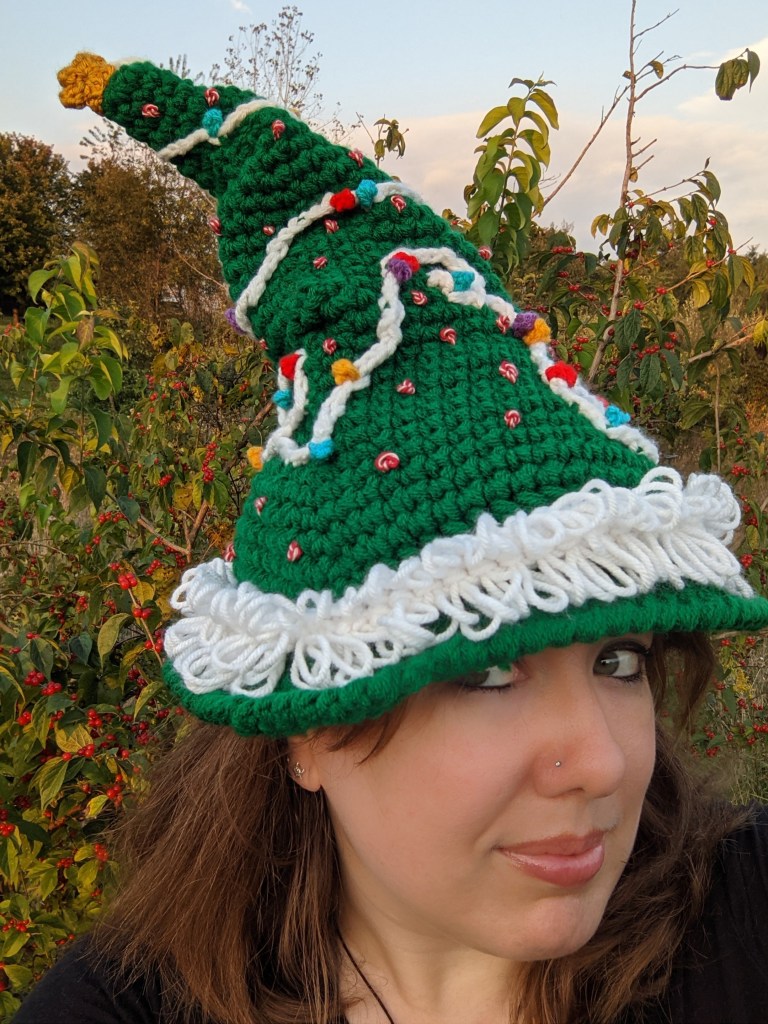 Bramble Witch is worked in super bulky yarn for the main hat and a variety of different yarns for the optional accessories. It’s a fantastic stash buster, too! There are endless combinations of textures and colors that you could use for different effects. In testing this pattern, I wanted to see how double-stranded worsted-weight yarn worked up and that led me down a whole different rabbit hole, and I came out on the other side with a Christmas Bramble version! Instructions for that version and its accessories are included in the Bramble Witch pattern. You could adapt this pattern to fit just about any occasion!