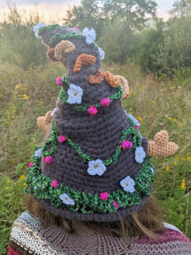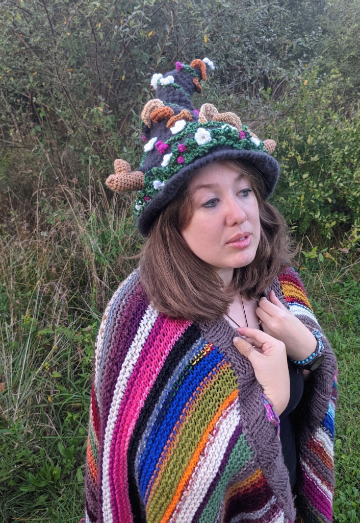 Having said all that, I wanted to whip up a pattern that expresses my love of all things autumnal. I am so very excited to announce the Bramble Witch hat pattern. The inspiration behind this hat once again goes back to my childhood, and the fairy stories I heard growing up. I still can’t pass any kind of mushroom without thinking how busy the fairies have been lately, so I just had to incorporate that into this magical hat. Mushrooms, antlers, berries, brambles, and a wee bit of magic. It doesn’t get much more Down Home than that for me! I am so, SO excited to wear this out to the Renaissance Faire this fall. I’m hoping to knock out a few more accessories for that look, so stay tuned for that in the upcoming weeks.