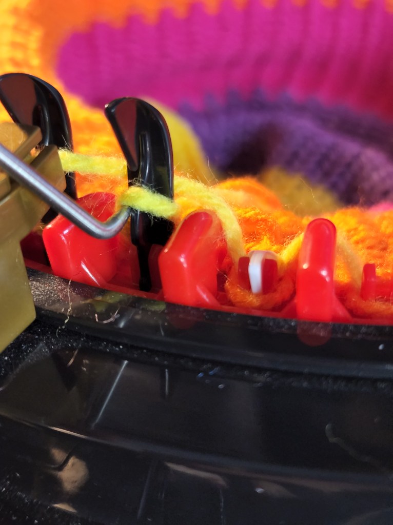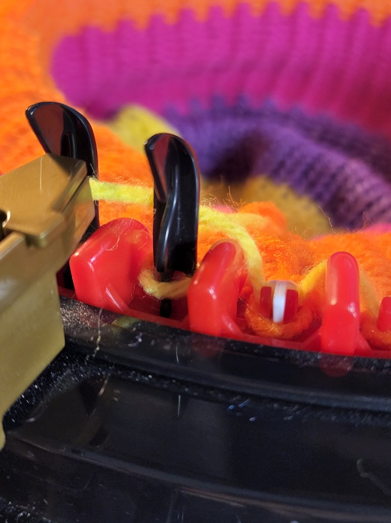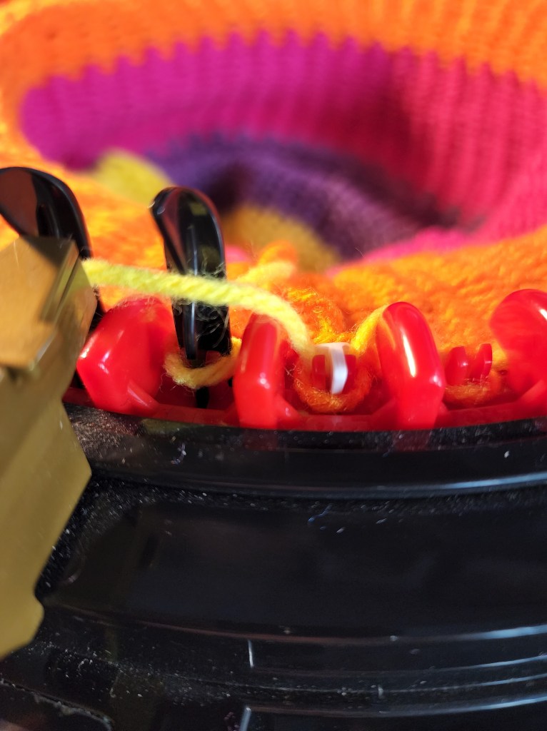End one color and start the next as you would normally do at the beginning of the row. Knit one row as usual and stop when you get back to the first black needle. Bring the working yarn around the back of the first black needle and pull the stitch that’s on the pegs below up with a loom hook or small crochet hook so that the first black needle grabs it and has a stitch to knit (or you will drop a stitch). Crank handle slowly and knit that stitch. Let the second black needle grab the working yarn and continue knitting as usual. Tie your color change ends together and trim them up a little as you go and then you don’t have to worry about them later as they’ll be inside the scarf. Remember to leave a super long tail of color A at the beginning and the end as you’ll be using that to close up the scarf.