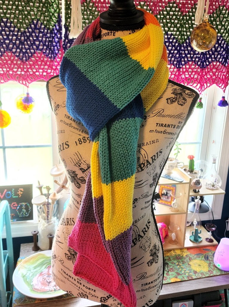 The Babysitter Scarf 2.0 has arrived! I worked this one up on my Addi Express King Size circular knitting machine. The original Tunisian crochet version is still available if you prefer that method. Or if you fancy doing one of each! You can check out that pattern for additional information. You might also notice that I’ve updated my yarn recommendations for this version and that’s due mostly to availability of brands and colors in my area. They are as close to the colors in the Tunisian crochet version as possible. You could use any combination of any of the yarns listed in either version to achieve this look.