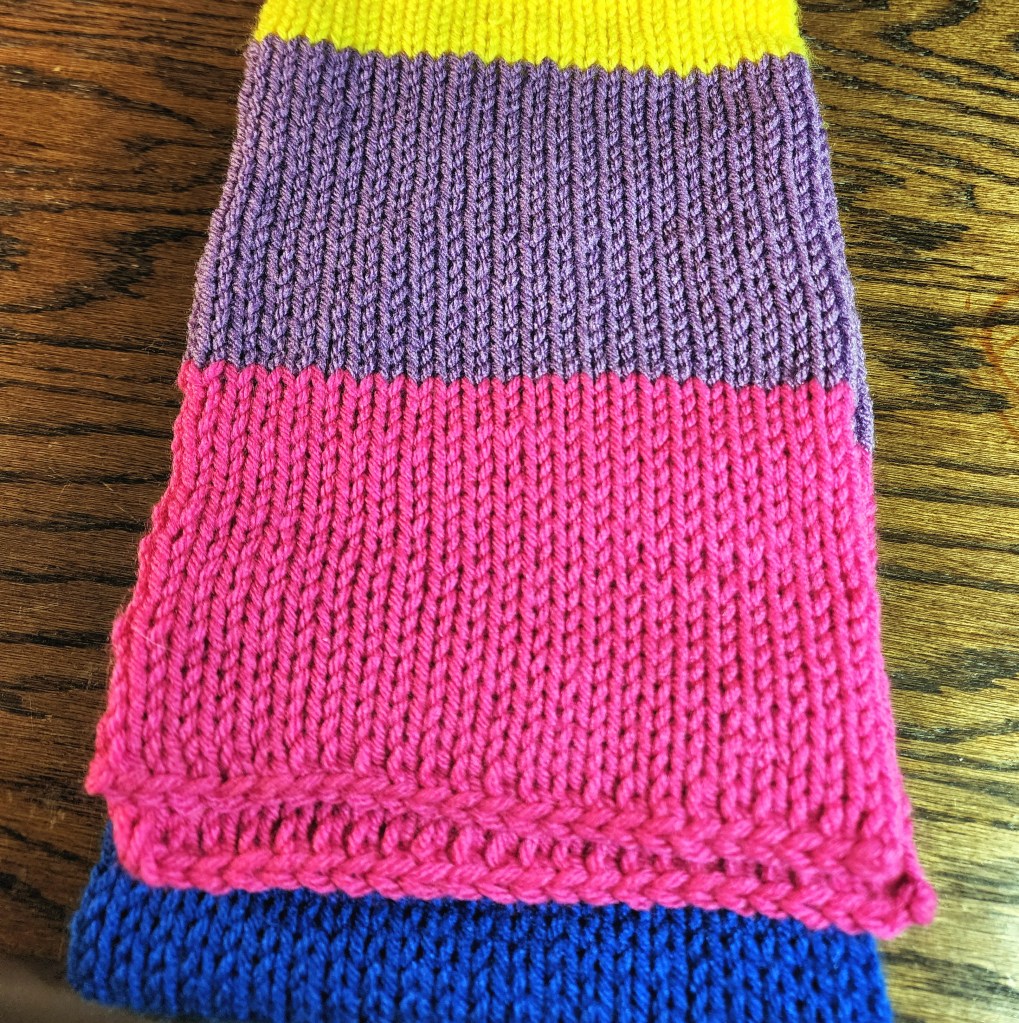 The recipe for this one is pretty straightforward. It assumes that you have a basic familiarity with circular knitting machines. If you’re new to these types of tools, there are a ton of video tutorials out there that can get you started. I have only tried this on the Addi Express King, but I would assume that it would work well on any other size machine that you want to try it on. The only special stitch that you need to be aware of is when changing colors. I did a slip stitch style color change to minimize the jog in color that you get when working in the round. I also secured my first and last rows using a single crochet closure to get a crisp, flat edge, but you can use another if you don’t crochet or have a different style that you prefer. I also keep my working yarn under light tension as I’m working. Each color block should measure 4” in length, so you may need to adjust your tension a little bit if you’re getting wildly different results.